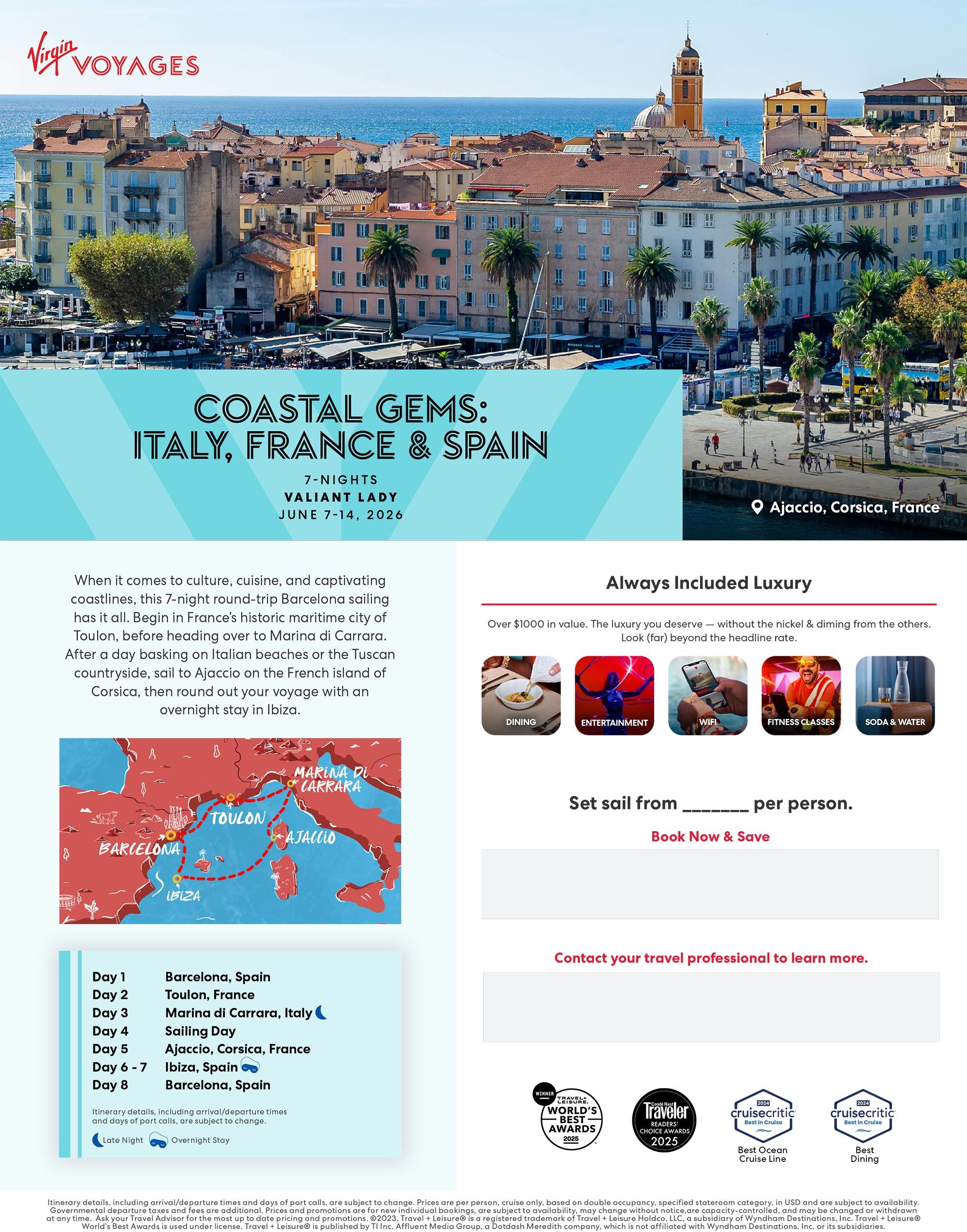 Barcelona, Provence (Toulon), Tuscany/Cinque Terre (Marina di Carrara), Ajaccio, Ibiza, Ibiza & Barcelona
