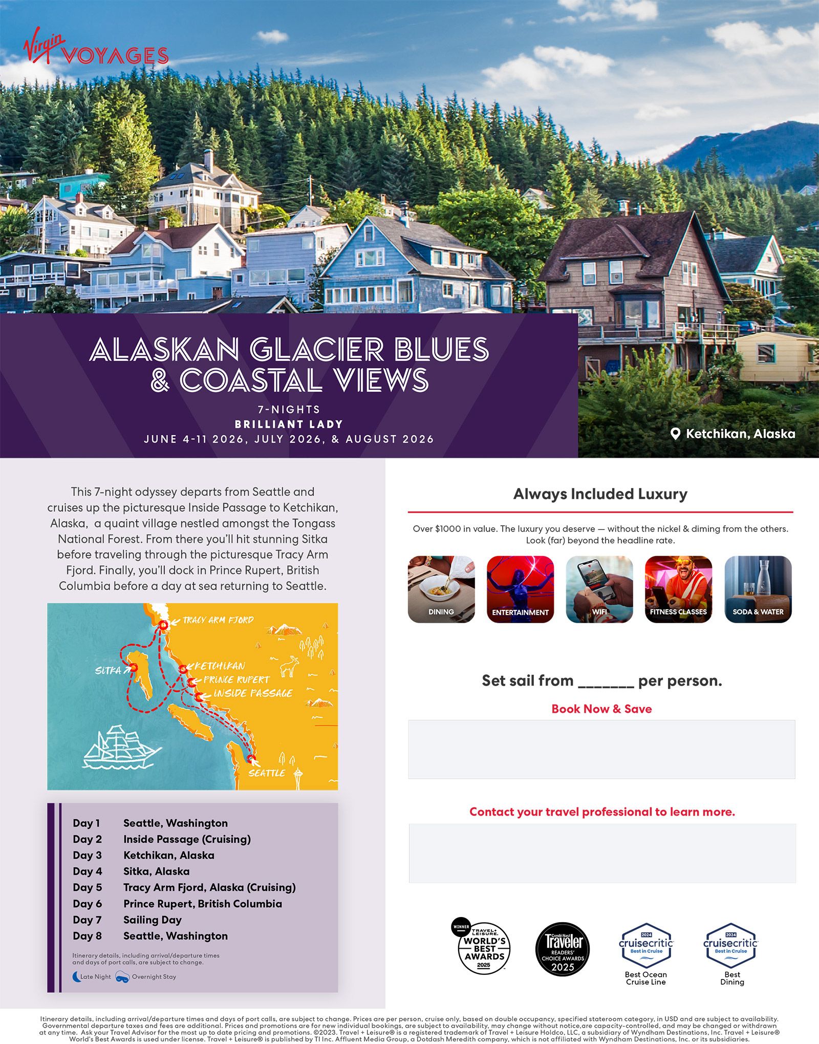 This 7-night odyssey departs from Seattle and cruises up the picturesque Inside Passage to Ketchikan, a quaint village nestled amongst the Tongass National Forest. From there you’ll hit stunning Sitka before traveling up the picturesque Tracy Arm Fjord (Cruising). Finally, you’ll dock in Prince Rupert, British Columbia before a day at sea returning to Seattle.